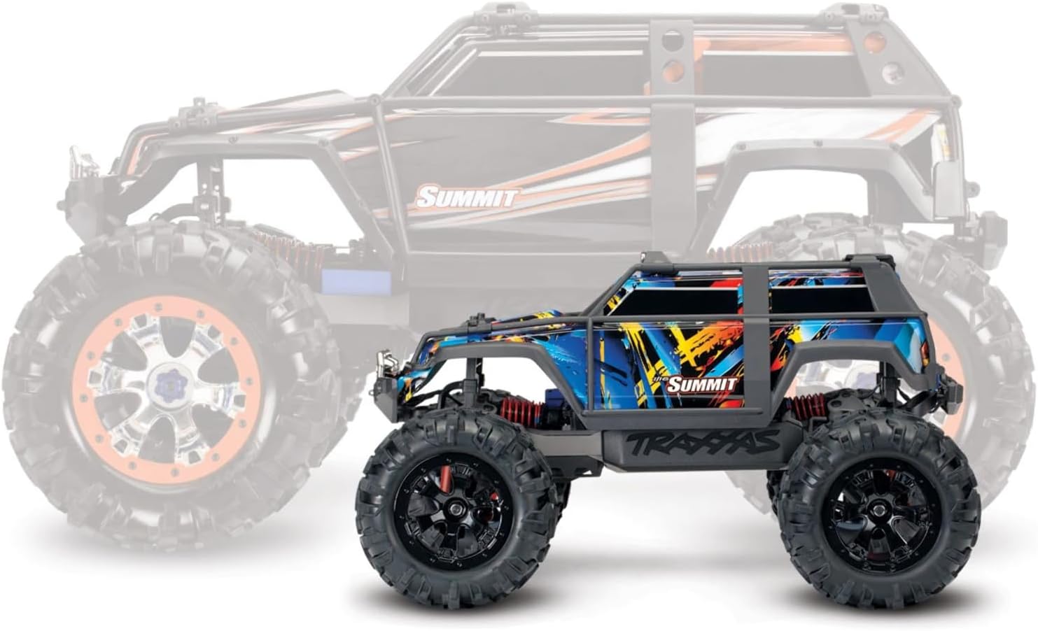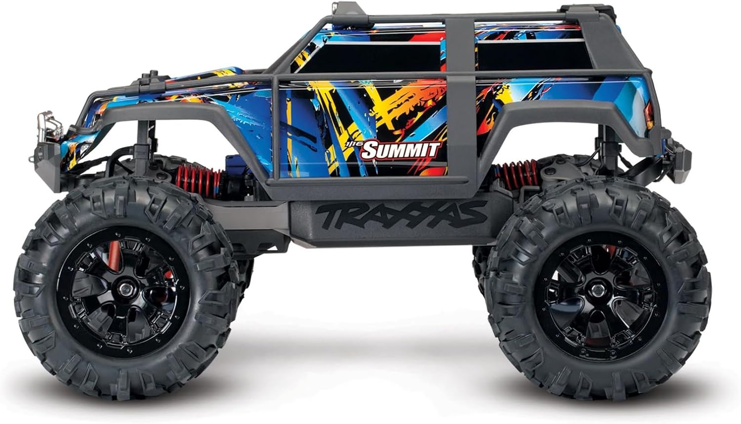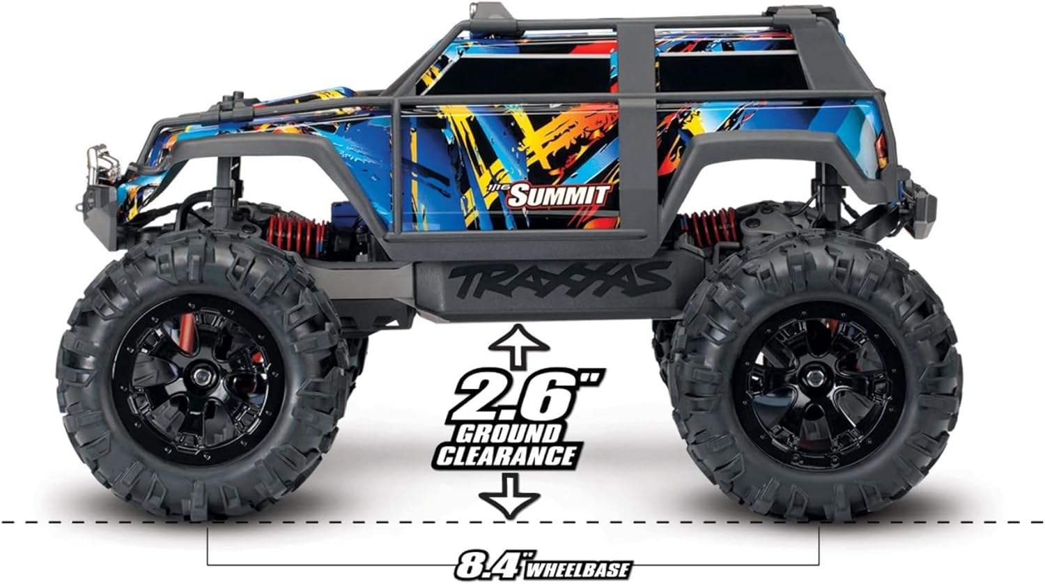 Leave it to Traxxas to stuff a 1/10 scale motor into a 1/16 scale truck! Summit’s mighty Titan? 12T 550 motor delivers nearly limitless torque for tire-scorching acceleration and all-terrain capability. With massive suspension travel. extreme Titan power. and 4-wheel drive traction. Summit tackles impossible terrain. Traxxas engineers combined all the big Summit’s go-anywhere versatility with waterproof electronics to make even your wildest adventures possible. Summit’s bright LED lights blaze a trail. making night runs more exciting than ever. The 1/16 Summit’s just-right size lets you enjoy hours of off-road fun anytime. anywhere! Traxxas packed all the capability. durability. and excitement of our award-winning models into 1/16 scale for fast. affordable RC fun. The Summit’s rocker-actuated suspension is adapted expertly to 1/16 scale with all its functionality and performance intact. right down to the oil-filled. threaded-body GTR shocks. This superior technology provides capability. performance. and tuning functions at the absolute pinnacle of truck design. The suspension and electronics integrate fully into a radically innovative monocoque chassis design. Intricately molded as a single piece. the chassis balances strength and weight with function and performance to surpass the standards of the mini category. In 1/16 scale. it is an even more impressive achievement of performance optimization that could only come from Traxxas. The Fastest Name In Radio Control.