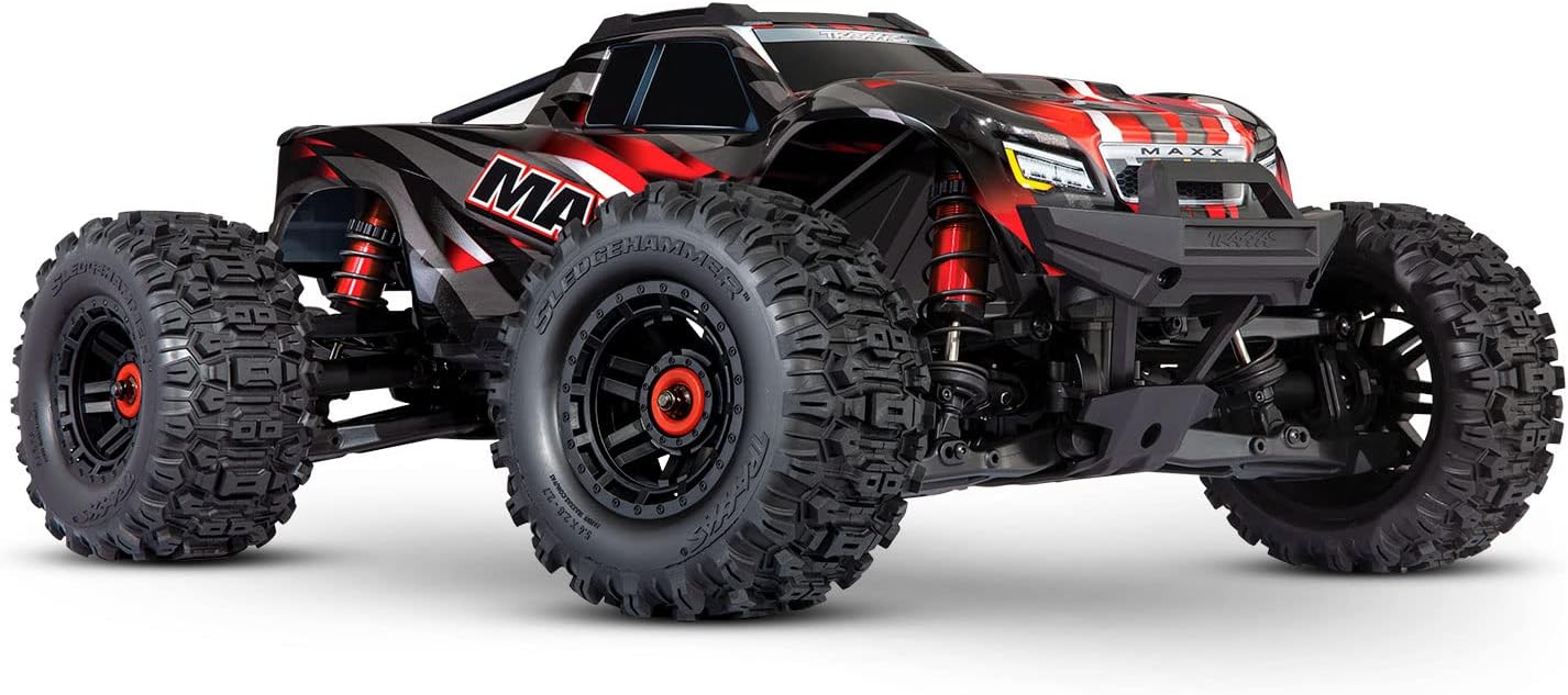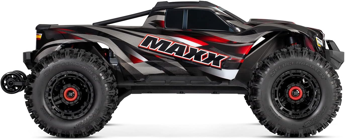 The Traxxas X-Maxx is a giant that forever changed the face of RC monster trucks. Its radical cutting-edge design. massive size. brutal strength. and unmatched power transformed X-Maxx into the stuff of legends. The 1/10 Traxxas Maxx expertly packages X-Maxx’s innovative design elements and jaw-dropping strength into a lighter. more compact. even more ferocious beast. Now the newest Maxx is even bigger. with a longer wheelbase. beefier Sledgehammer tires. and that incredible WideMaxx stance for even more intense action. Let the fun begin! Features: THE MAXX EXPERIENCE: Maxx turns up the dial on fun with even more of what you crave. The new Maxx doubles down on strength and durability with a longer and wider stance for greater stability to match its blistering 60+ mph performance. Bury the throttle. fly through corners. and let the new Maxx turn your wildest full-throttle dreams into reality. 60+ MPH MAXX MUSCLE: Traxxas Velineon brushless power hits hard with massive 4s punch for an awe-inspiring 60+ mph top speed and effortless wheelies on demand. The high-output 540XL motor features a beefy 5 mm shaft. aluminum heat sink. and a powerful fan. Of course it’s all fully protected with Traxxas’ innovative waterproofing. TRAXXAS TOUGH: Maxx is overbuilt with components found on much larger and heavier vehicles to withstand extreme punishment and intense driving action. The Maxx chassis absorbs and dissipates impact energy across the entire structure for superior strength. Huge threaded-aluminum GT-Maxx shocks with oversized shafts soak up massive jumps for high-flying fun at every turn. Includes: Maxx. Ready-To-Race model with Traxxas 540XL brushless motor VXL-4s waterproof electronic speed control with integrated telemetry Quick Start Guide TQi 2.4GHz radio system High quality maintenance tools Requires: LiPo Battery: Traxxas recommends a 4-cell 14.8V Power Cell LiPo battery for maximum perf