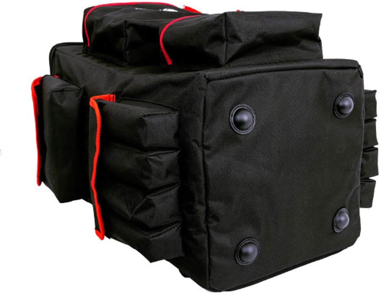 • Features: Perfect for TRX-4 and other 1/10 scale vehicles Thick. weather-resistant Nylon construction Heavy duty zippers Padded adjustable shoulder straps and chest strap Back panel padded for comfort Reinforced bottom panel with protective feet Ample Storage Large padded center compartment Dual front zipper pockets Two subdivided battery compartments with room for eight batteries Two hooded compartments for and tools. parts. and gear